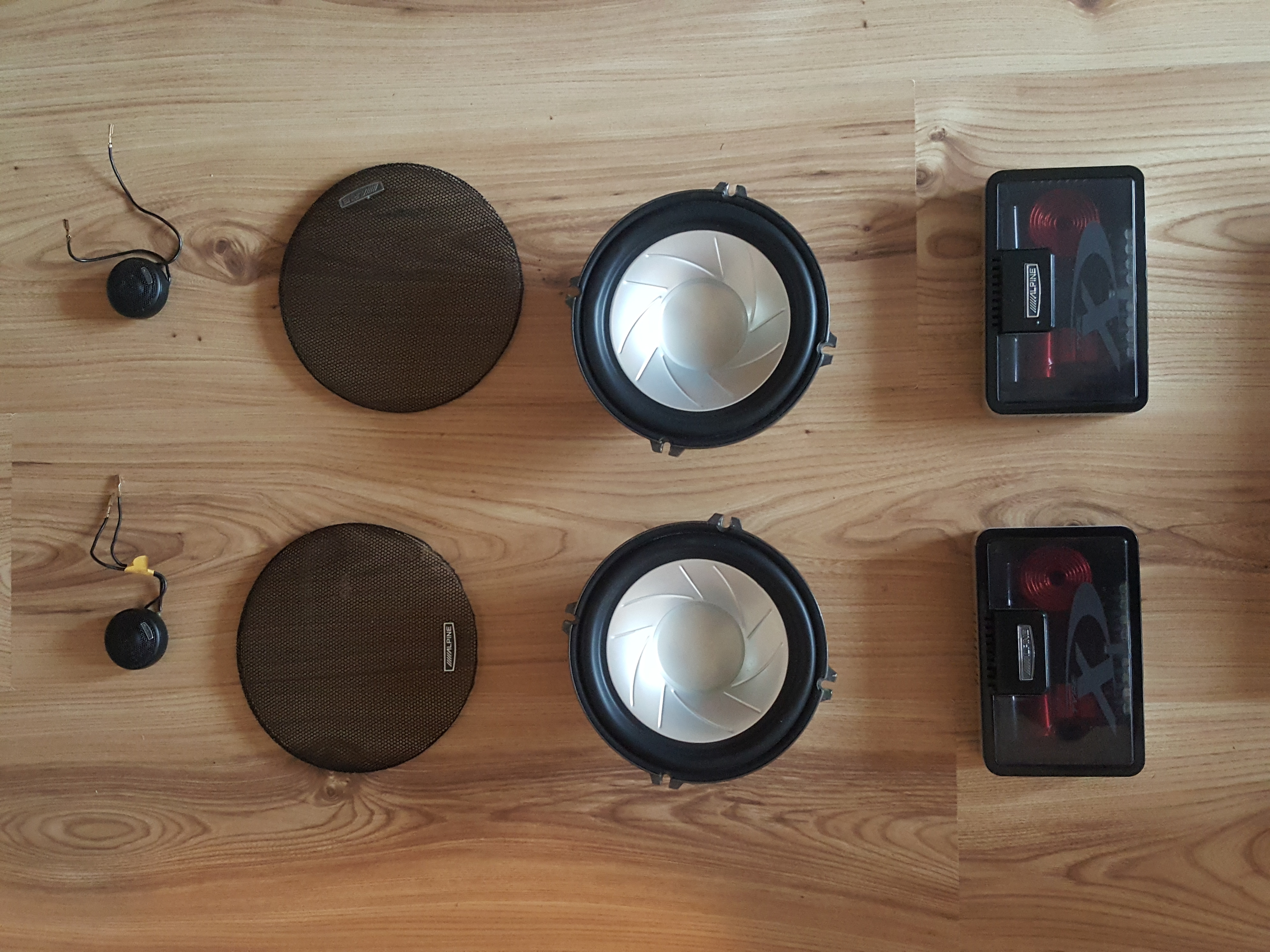 2. Komponentai Alpine SPX17REF. Aukštų dažnių laideliai nulūžę ir turbūt nelabai juos ten išeitų tvarkingai prilituoti. Vienas midbosas turi vos matomą įtrūkimą, kurio įtakos garsui neišgirdau. Kaina 80 eur.